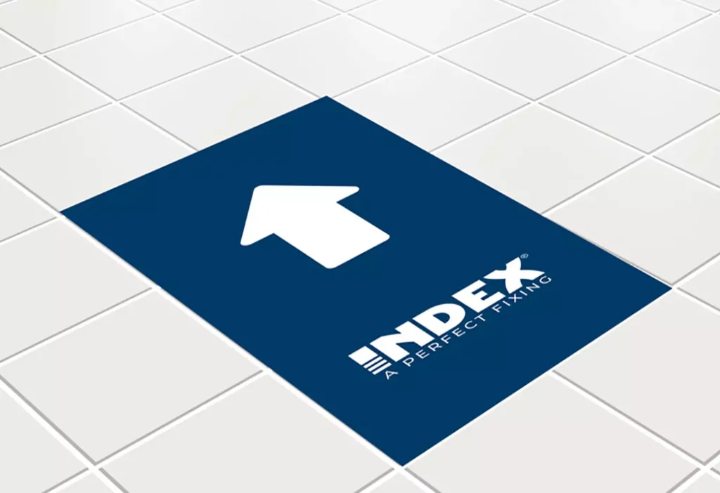 Vinilos adhesivos para pegar en el suelo del establecimiento. Señalan el camino a seguir para llegar al lugar donde se encuentra el producto INDEX dentro del establecimiento.