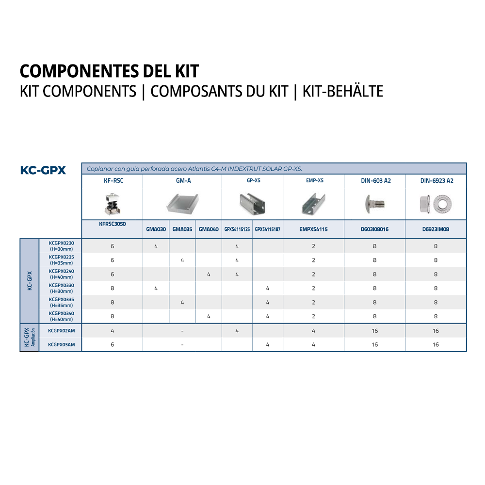 | Code | Nº Modules | Plate heigt [mm] | Inclination | Min. Order Qty. | Pcs Box | Pcs Masterbox | EAN | Technical info. |