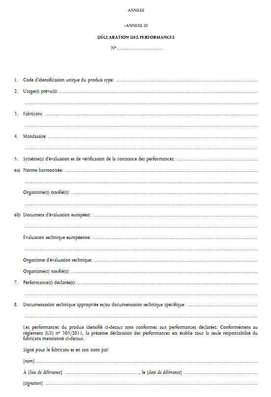 La déclaration de performances qui exprime les performances du produit par rapport à ses caractéristiques essentielles, est émise par le fabricant lorsque le produit est mis sur le marché et qu’il est couvert par une norme harmonisée ou qu’il est conforme à une Évaluation Technique Européenne (si le fabricant a choisi de suivre cette procédure), assumant ainsi la responsabilité de la conformité du produit avec la performance déclarée.