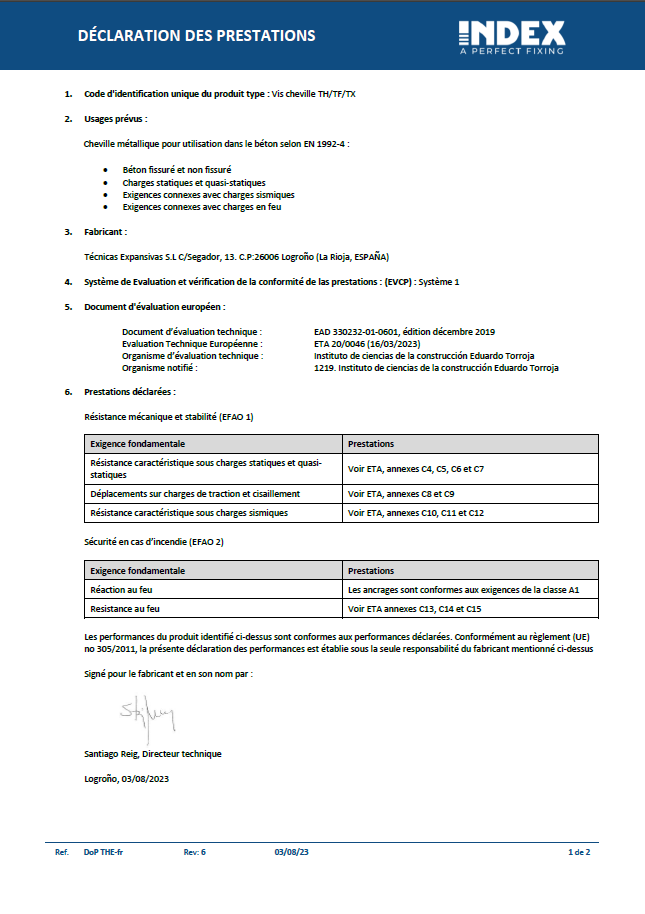 Un exemple du contenu de la déclaration de performances conformément au règlement européen sur les produits de construction ainsi qu’un cas réel sont joints en annexe. Les déclarations de performances des produits INDEX peuvent être téléchargées sur notre site web, dans la section « documentation » du produit correspondant.