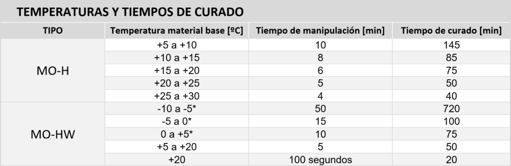 La duración de este tiempo dependerá directamente de la temperatura del material base. Como ejemplo ver la tabla de los productos MO-H y MO-HW en la tabla. - Tiempo de curado: es el tiempo necesario para que se complete la reacción química y se alcance la resistencia nominal de la fijación. Como todas las reacciones químicas, la velocidad de reacción depende de la temperatura: mayores tiempos de curado a bajas temperaturas y menores tiempos a altas temperaturas.