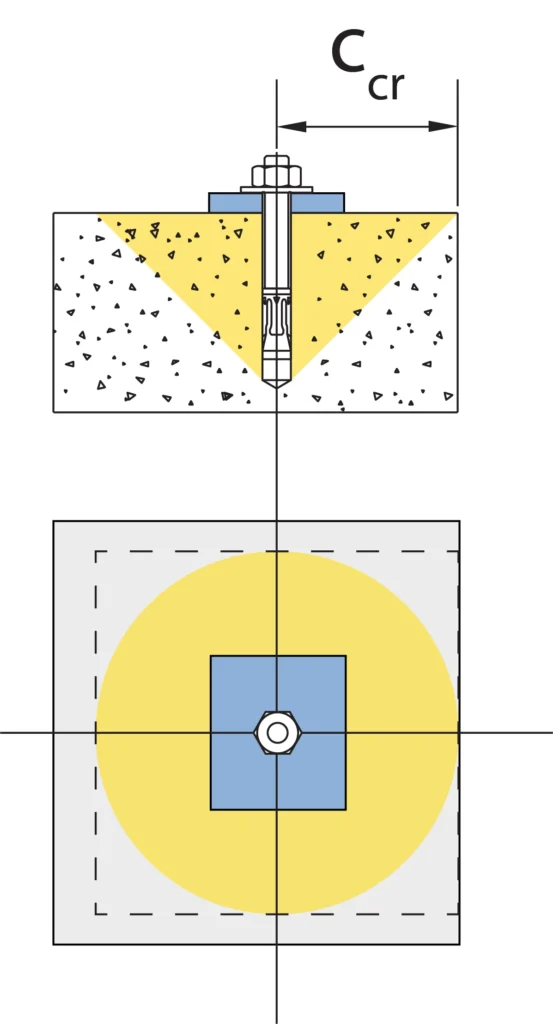- Distancia crítica al borde, ccr: distancia a la que se puede instalar el anclaje respecto a cualquier borde del material base sin que se vea afectada su capacidad de resistencia. Por debajo de esa distancia es posible realizar la fijación, hasta la distancia mínima al borde, pero se deben aplicar determinadas ecuaciones que reducen su resistencia. Como criterio general el valor de la distancia crítica al borde será mayor igual que la distancia mínima al borde: ccr ≥ cmin