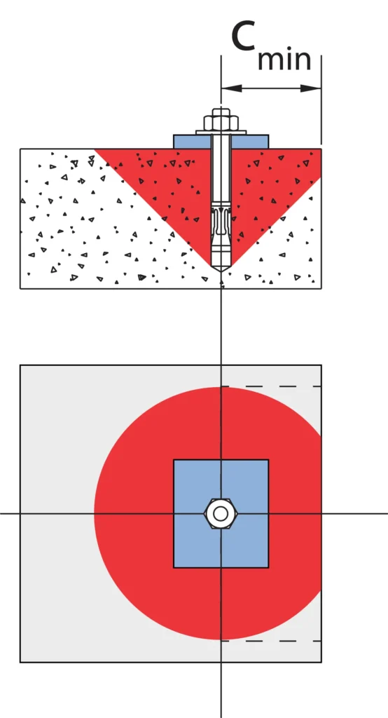 - Distancia mínima al borde, cmin: distancia mínima de instalación del anclaje respecto a cualquier borde del hormigón. El anclaje no se puede instalar a una distancia inferior ya que hay riesgo de fisuración del material base, incluso sin aplicar ninguna carga a la fijación.