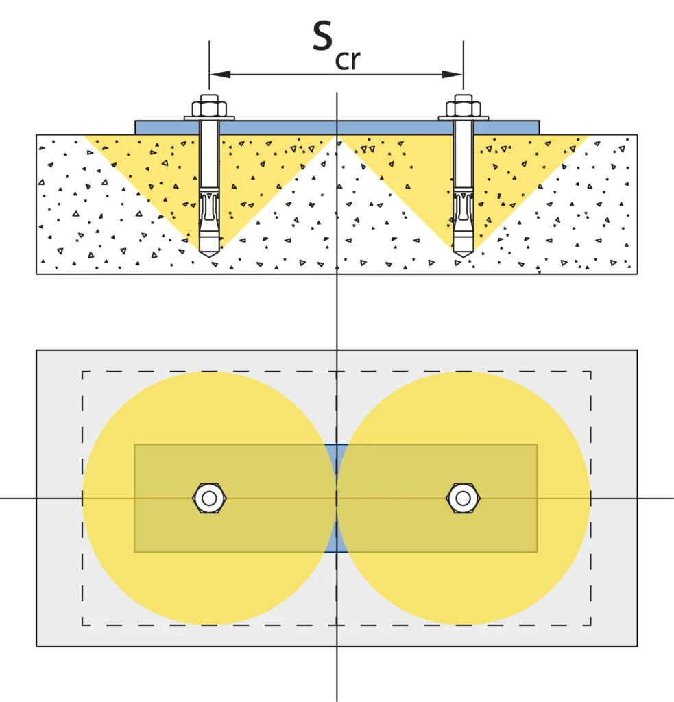 - Espaciado crítico, scr: distancia a la que se puede instalar el anclaje respecto a cualquier otro anclaje sin que se vea afectada su capacidad de resistencia. Por debajo de esa distancia es posible realizar la fijación, hasta el espaciado mínimo, pero se deben aplicar determinadas ecuaciones que reducen su resistencia. Como criterio general el valor del espaciado crítico entre anclajes será mayor o igual que el espaciado mínimo: Scr ≥ Smin