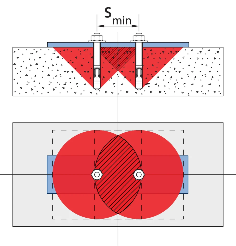 - Espaciado mínimo, smin: distancia mínima de instalación del anclaje respecto a cualquier otro anclaje. El anclaje no se puede instalar a un espaciado inferior, ya que hay riesgo de fisuración del material base, incluso sin aplicar ninguna carga a la fijación.