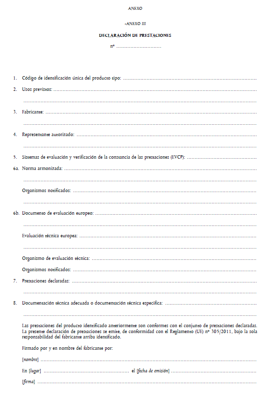La Declaración de Prestaciones, que expresará las prestaciones del producto en relación con sus características esenciales, será emitida por el fabricante cuando el producto se introduzca en el mercado y esté cubierto por una norma armonizada o sea conforme a una Evaluación Técnica Europea (si el fabricante ha querido seguir ese procedimiento), con lo que asume la responsabilidad de la conformidad del producto con la prestación declarada.