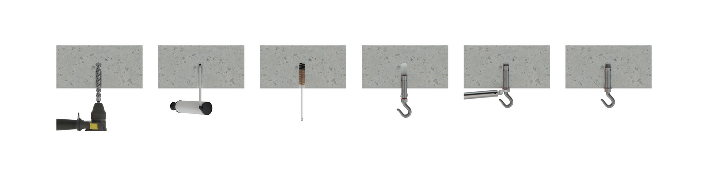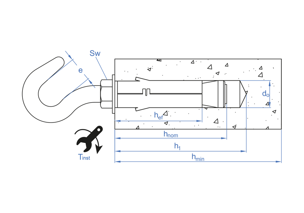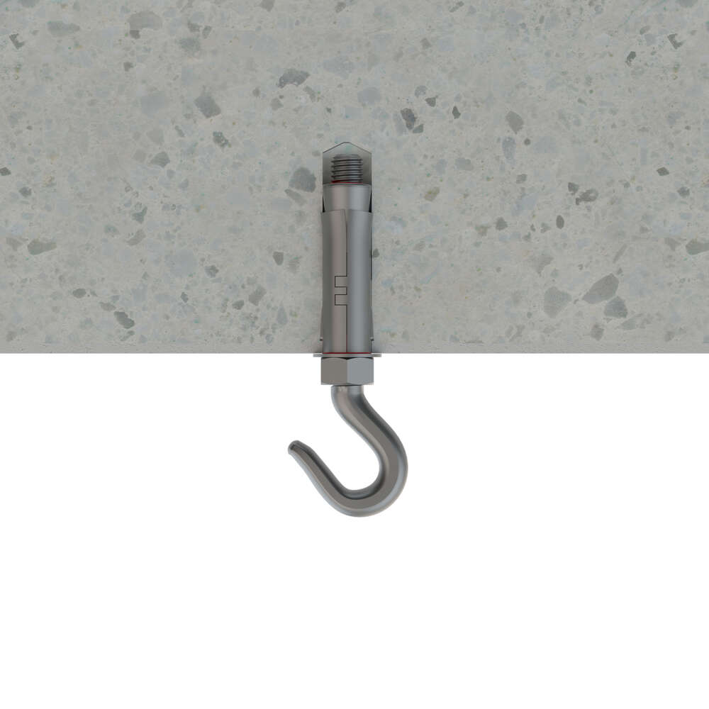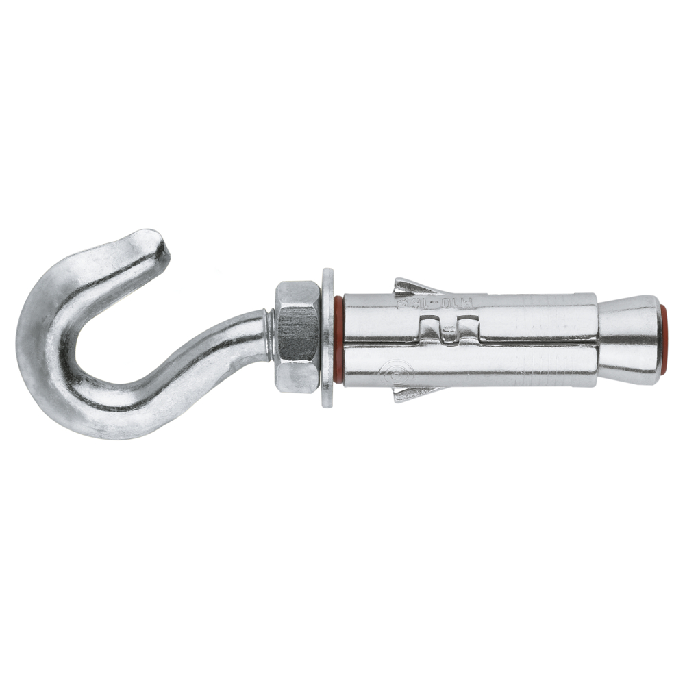 Anclaje antigiro con gancho, para cargas altas en hormigón no fisurado y otros materiales macizos. El gancho permite la instalación posterior de elementos como vallados o cables. Funciona mediante expansión por par controlado. Fabricado en acero zincado.