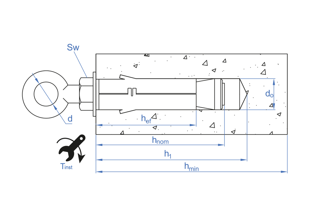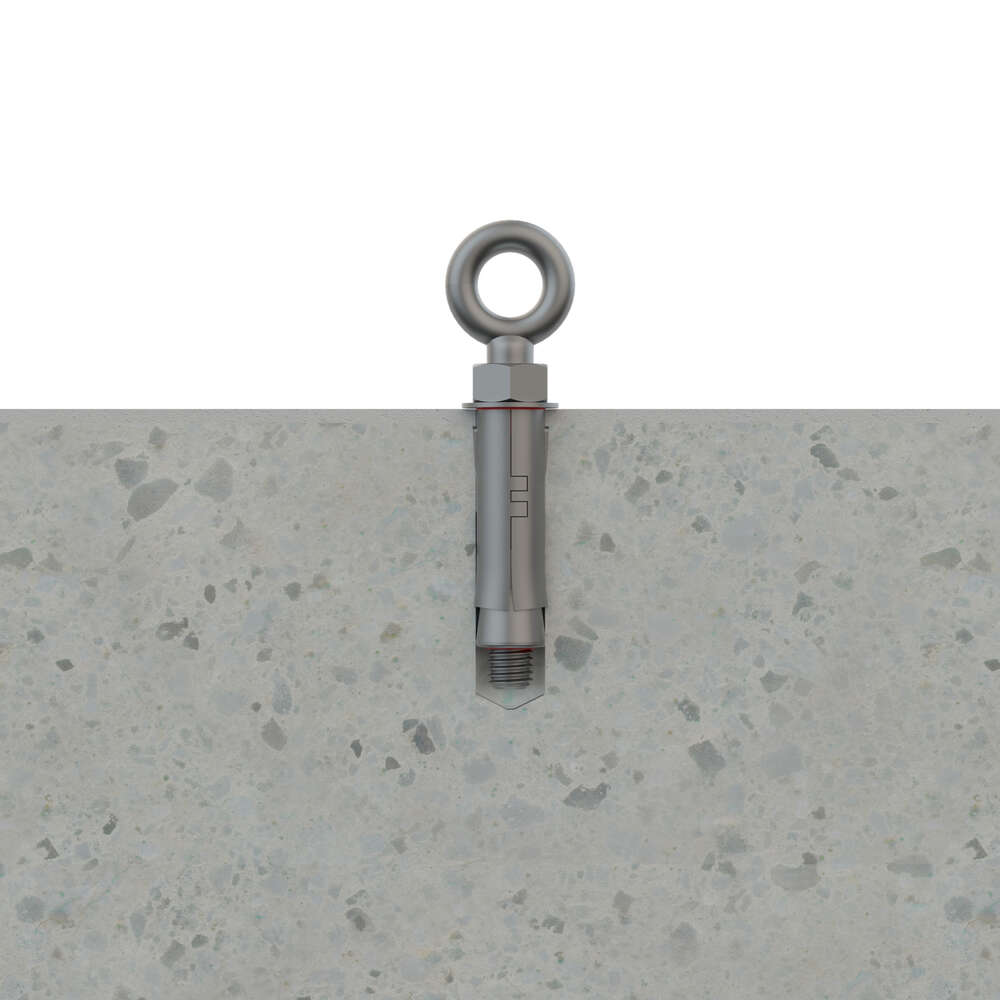 Anclaje antigiro para cargas altas en hormigón no fisurado y otros materiales macizos. Incorpora una argolla, que permite la instalación posterior de elementos como cables o entutorados. Anclaje de espansión por par controlado. Fabricado en acero zincado.