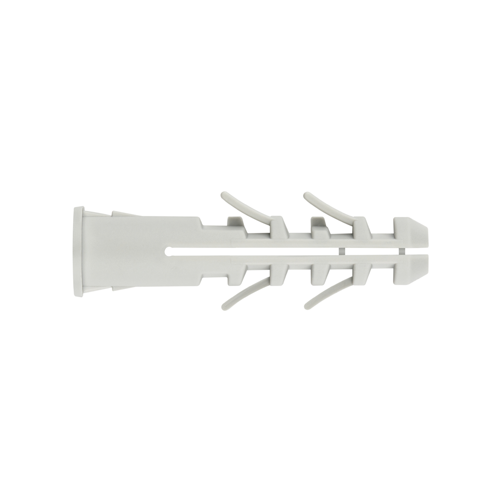 Taco de nylon con collarín. Se puede emplear sobre superficies macizas como hormigón, piedra, ladrillos macizos o de adobe. Permite fijar elementos ligeros como toalleros, plafones o focos. Cuenta con aletas laterales que impiden que el taco se mueva durante el proceso de instalación.