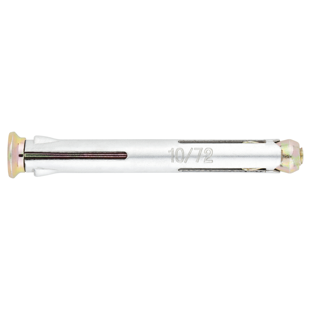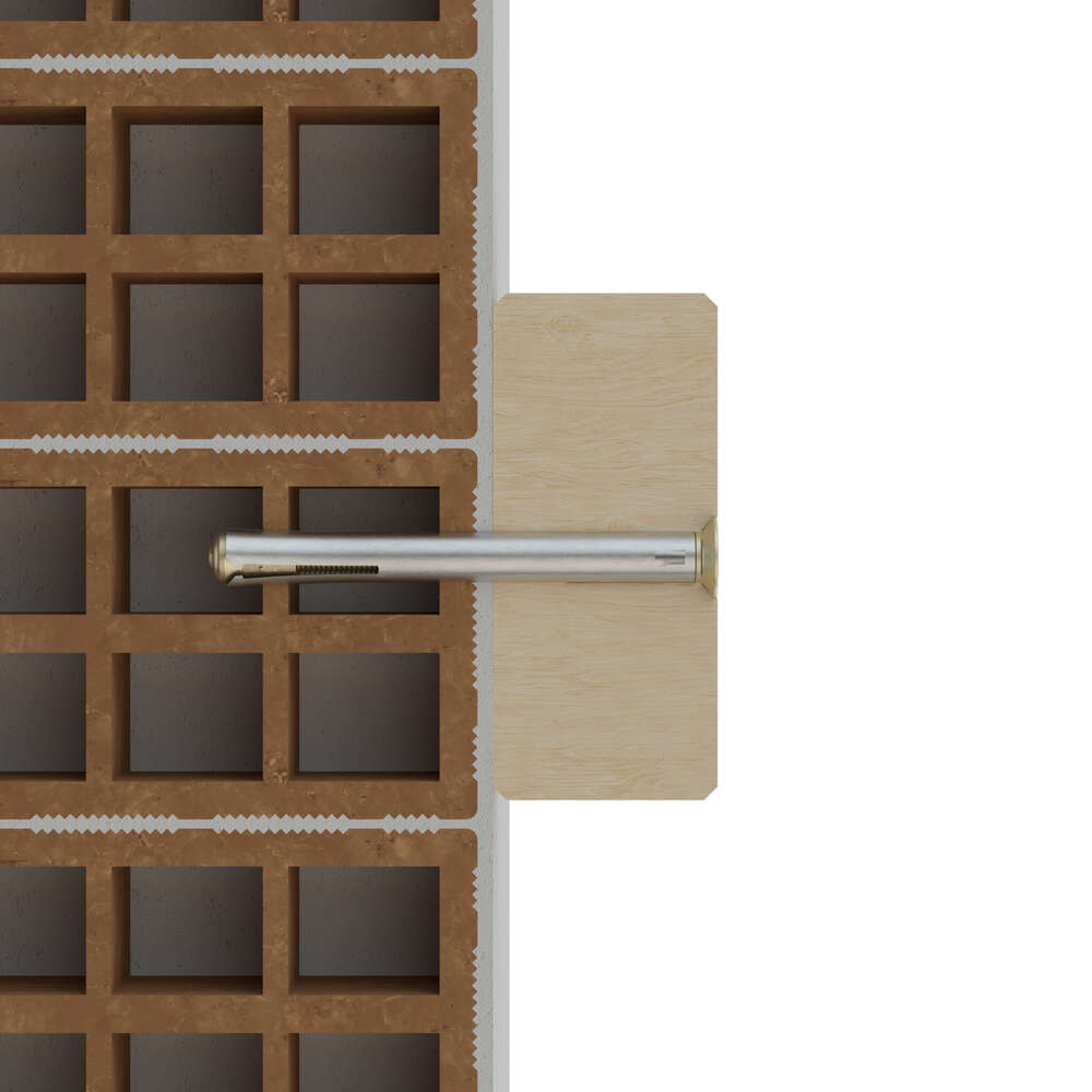 Anclaje de expansión con tornillo para la fijación de marcos y premarcos de puertas y ventanas a materiales macizos y huecos. Incorpora aletas laterales antigiro, que impiden el movimiento del taco durante la expansión. La camisa cuenta con un recubrimiento zincado y el tornillo está bricomatdo.