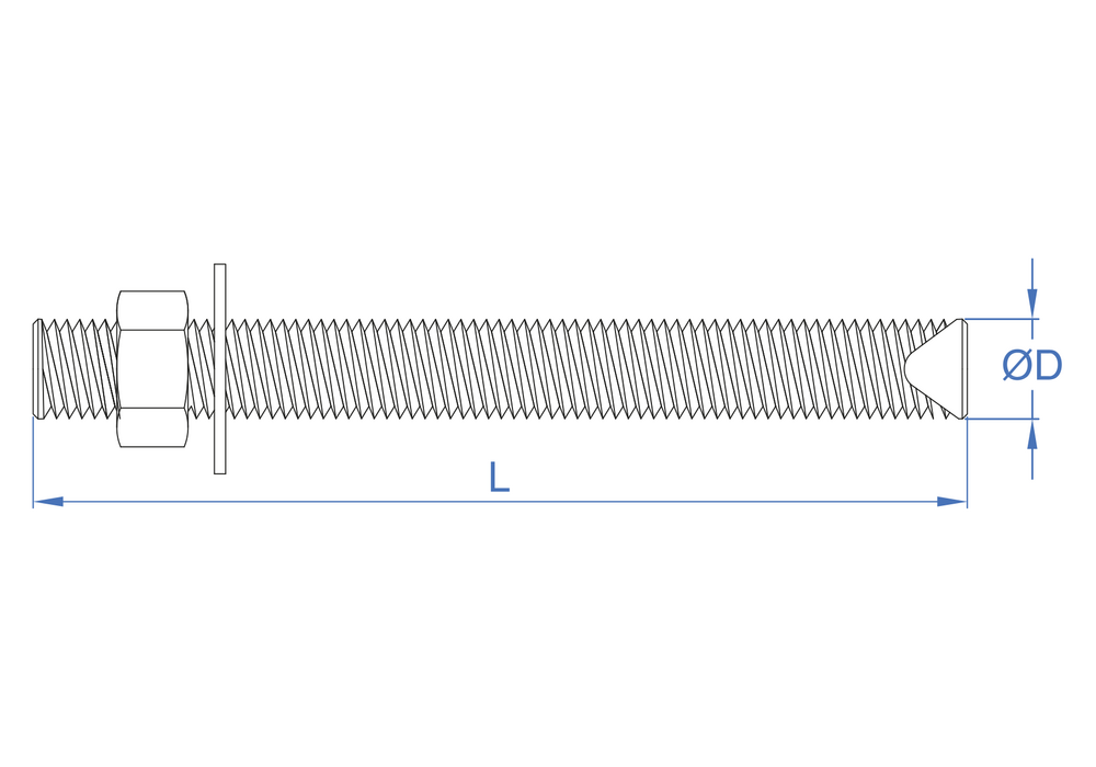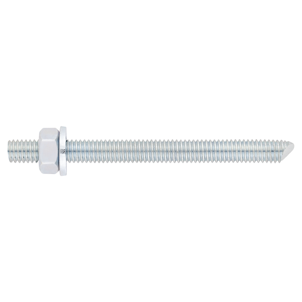 Espárrago de rosca métrica con tuerca y arandela para anclajes químicos, compatible con toda la gama de tacos químicos de INDEX. Está fabricado en acero con recubrimiento zincado (clase 5.8 ).