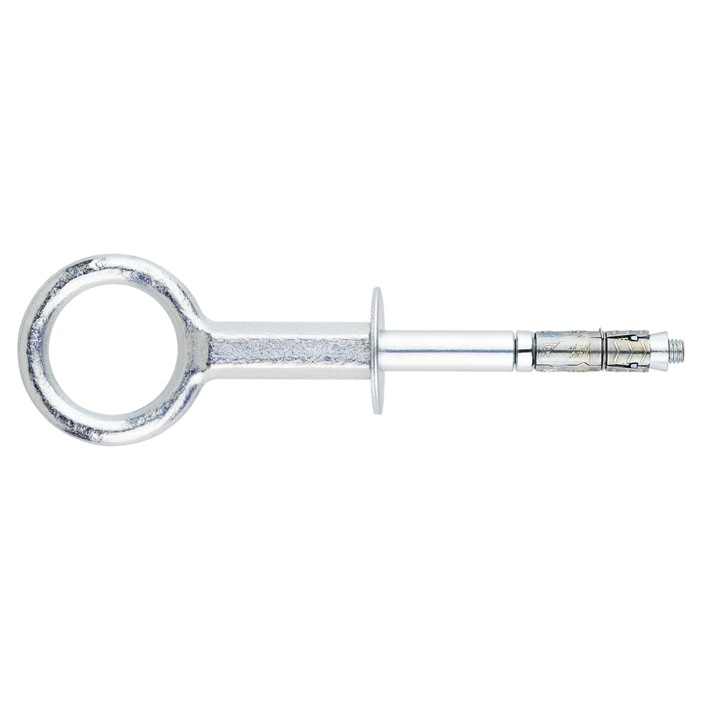 • [ANCLAJE PARA ANDAMIOS Y FACHADAS] Anclaje con argolla soldada de Ø50 mm y taco de expansión de zamak, diseñado para la fijación de andamios, pancartas, carpas o carteles sobre fachadas, paredes o suelos.