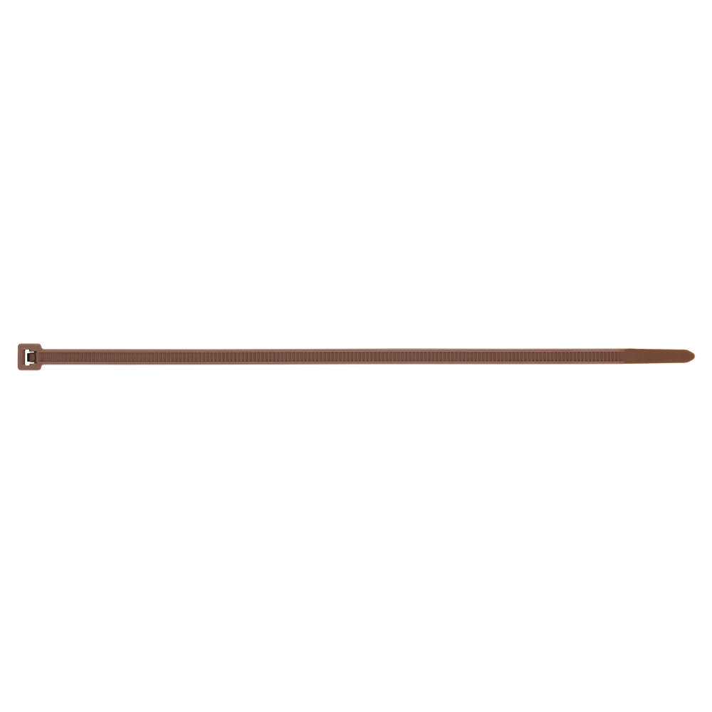 Brida de nylon marrón. Se puede usar para el atado de cables, mangueras o tubos en instalaciones de distinto tipo. Sus características garantizan una instalación rápida y sencilla, tanto manualmente como mecánicamente. El color marrón permite identificar con facilidad los elementos atados.