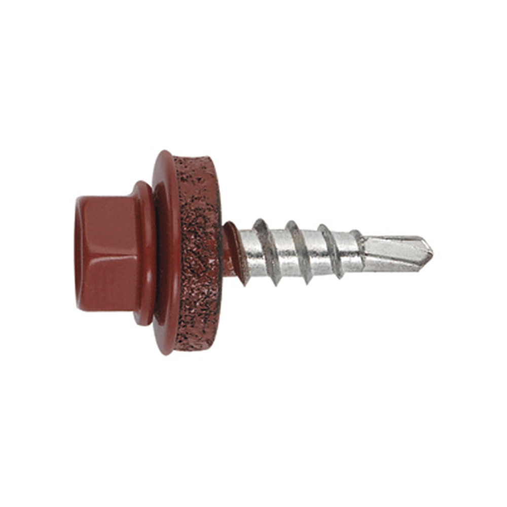 Tornillo con cabeza hexagonal y arandela estampada para fijar placas metálicas sobre estructuras de madera. Permite instalar elementos como cubiertas de chapa metálica de forma sencilla, segura y efectiva. Su punta broca permite perforar el material sin necesidad de hacer agujeros previos. Cuenta con una rosca para metal de 60º. Está fabricado en acero zincado. La cabeza y la arandela están lacadas en color rojo teja (RAL 3009).
