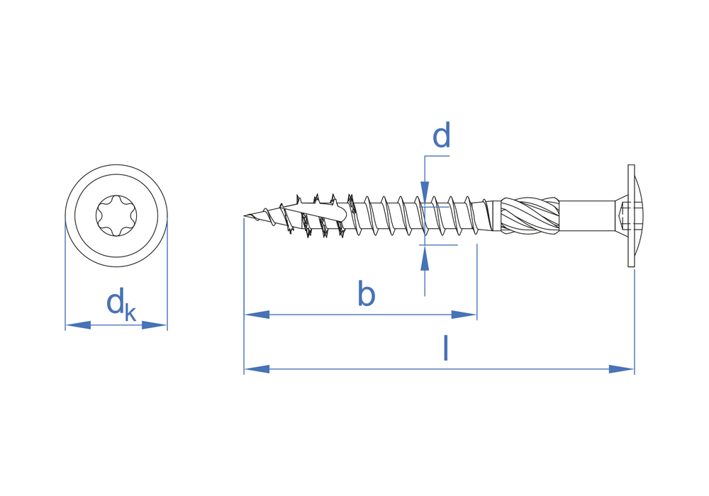 Tirafondo para madera, con huella TX y cabeza ancha. Cuenta con una punta ultraafilada de tipo S y una rosca de paso optimizado que permiten una inserción fácil y rápida en la madera. Se puede emplear para el montaje de estructuras de madera o trabajos de carpintería. Su diseño asegura una distribución óptima de las cargas en todo tipo de aplicaciones. Está fabricado en acero con recubrimiento bricomatado.