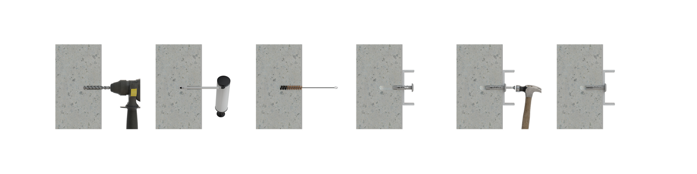 • [TACO + TORNILLO DE ALTA EXPANSIÓN] Taco clavable de alta expansión con cabeza ancha premontado con tornillo de cabeza avellanada. El collarín avellanado impide que el taco se introduzca por completo en el taladro durante la instalación.