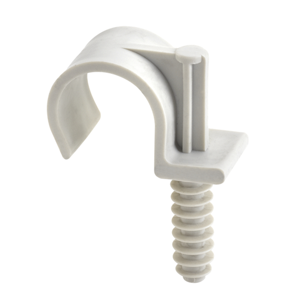 Abrazadera de fijación directa. Permite fijar a presión cables o tubos de acero, cobre o PVC. Se instala por golpeo con la ayuda de un martillo. Requiere taladro previo. Está fabricada en nylon y no cuenta con halógenos.
