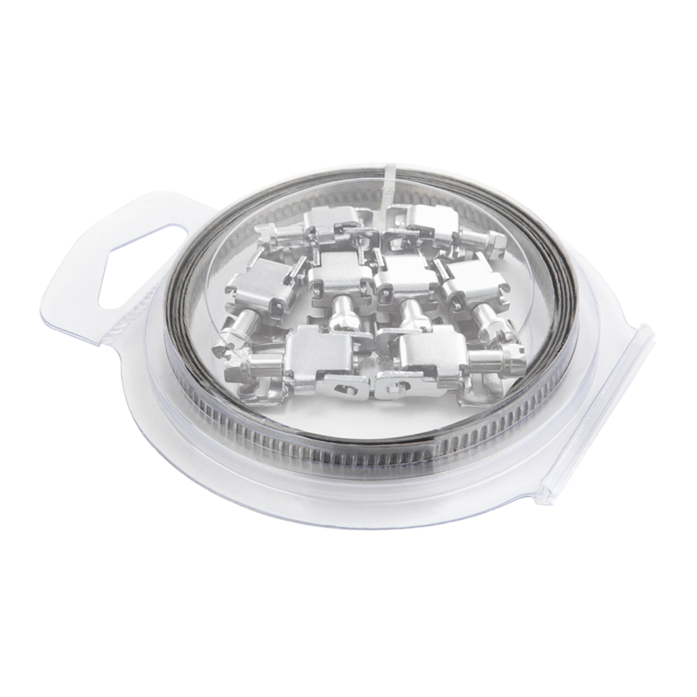 Kit para el montaje de abrazaderas sin fin. Incluye una banda no perforada de 3 metros y 8 cabezales con tornillo de ajuste. Permite una gran flexibilidad al poder adaptar con facilidad las abrazaderas sin fin al tamaño de cada tubería. Se puede emplear para sujetar tuberías ligeras en instalaciones de calefacción o ventilación, entre otras. La cinta está fabricada en acero inoxidable AISI 403 y los cabezales en acero inoxidable AISI 201.