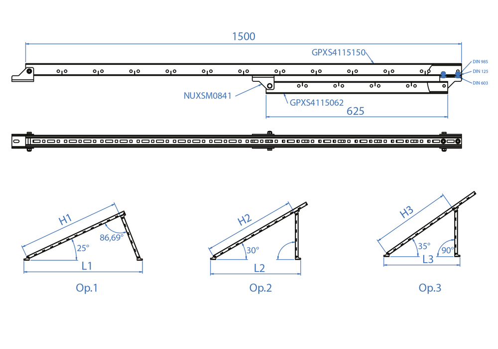 Triángulo regulable INDEXTRUT para el montaje de paneles solares sobre cubiertas. Se puede emplear junto a las guías perforadas GP-XS para la instalación de placas en formato continuo. Viene preensamblado y está formado por dos guías perforadas INDEXTRUT y tres nudos articulados INDEXTRUT. Incluye tornillos D603I08016 y tuercas D6923IM08 para su fijación. Permite instalar las placas con un ángulo de 25º y 35º. Los perfiles están fabricados en aluminio y las tuercas y tornillos en acero inoxidable A2.