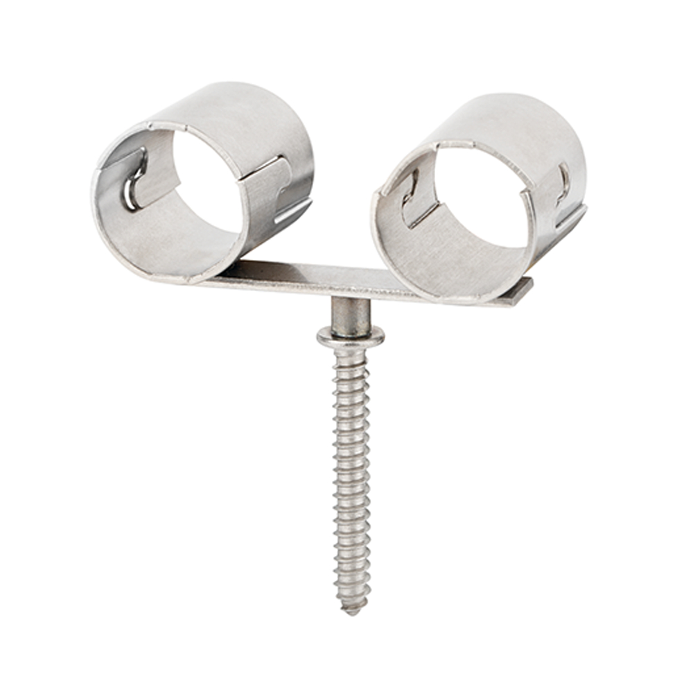 Abrazadera doble Indextube, diseñada para fijar tubos ligeros de entre Ø15 a Ø22 mm (según el modelo). Permite el montaje de dos tuberías en paralelo. Se puede emplear para instalar tubos de acero, cobre o plásticos como el PVC en instalaciones de saneamiento. Cuenta con un tirafondo premontado, que ayuda a agilizar su instalación sobre distintos tipos de superficies. Está fabricada en acero inoxidable A2, un material que permite su uso en ambientes con niveles altos de corrosión.