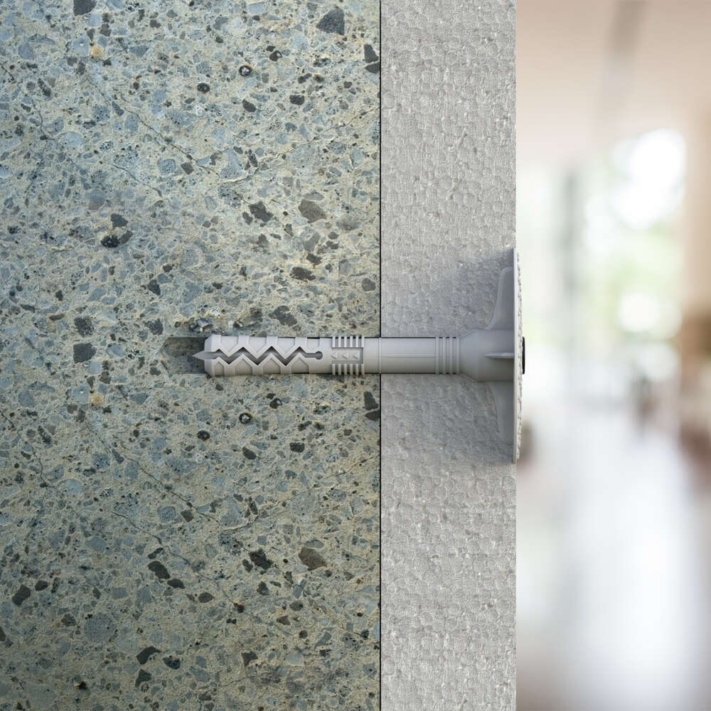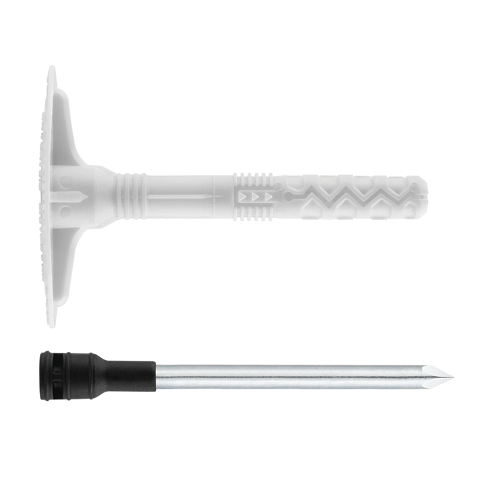 Taco para paneles aislantes con clavo metálico. Permite fijar con facilidad materiales como poliestireno expandido, lana mineral o poliestireno extruido en sistemas de aislamiento térmico exterior. Cuenta con la homologación ETA 21-0823. El clavo incorpora un tapón de poliamida que ayuda a reducir los puentes térmicos. El taco está fabricado en poliamida y el clavo en acero zincado.