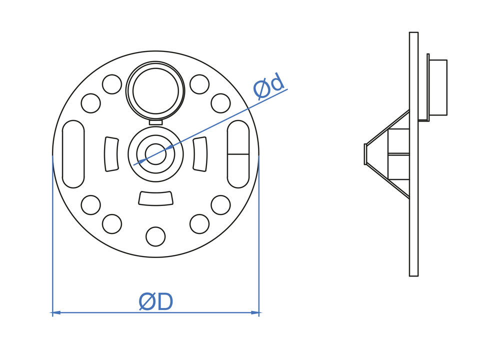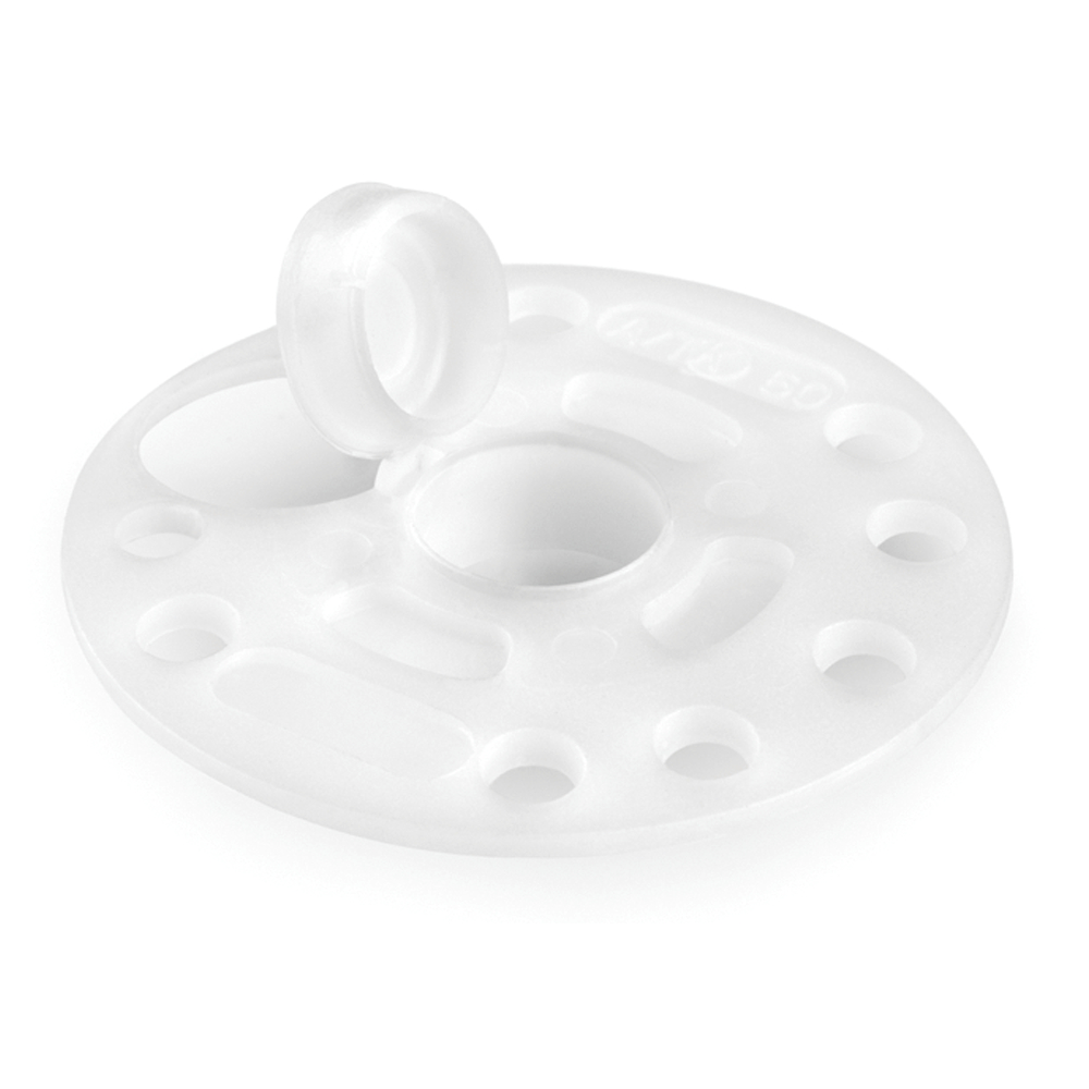 Arandela o rosetón de presión, diseñada para fijar materiales aislantes a superficies de madera o metal mediante tornillos. Permite fijar aislamientos de distintos espesores de manera rápida y sencilla. Su estructura incorpora un tapón que evita la rotura del puente térmico. Se puede emplear con distintos tipos de tornillos. Está fabricada en polipropileno.