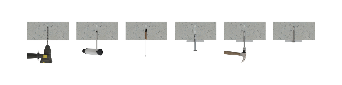 Anclaje de impacto con cabeza plana para hormigón fisurado y no fisurado. Diseñado para fijar elementos de cargas bajas en techos u otras superficies. Homologado ETE para aplicaciones no estructurales. Anclaje de expansión, con eje de acero zincado y clip de acero Atlantis C3-L.