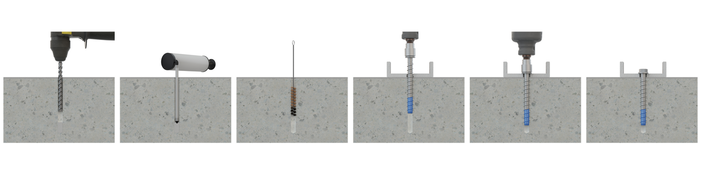 • [CARGAS ALTAS] Diseñado para realizar fijaciones estructurales en hormigón, así como la instalación de elementos como barandillas y pasamanos, estanterías y racks o acristalamientos y ventanas. Permite su instalación con reducidas distancias entre anclajes y al borde del elemento de hormigón.